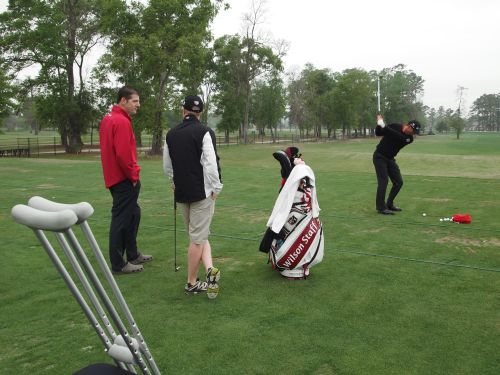 Padraig Harrington practices on Redstone range as caddy Ronan Flood and Wilson Staff's Ron Graham (off his crutches) look on
