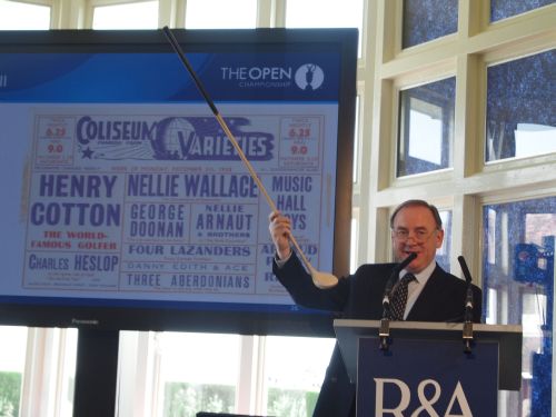 R & A CEO Peter Dawson at Tuesday's Pre-Open Press Conference showing off a replica of Sir Henry Cotton wood that he used to win 1934 Open at Royal St. George's.