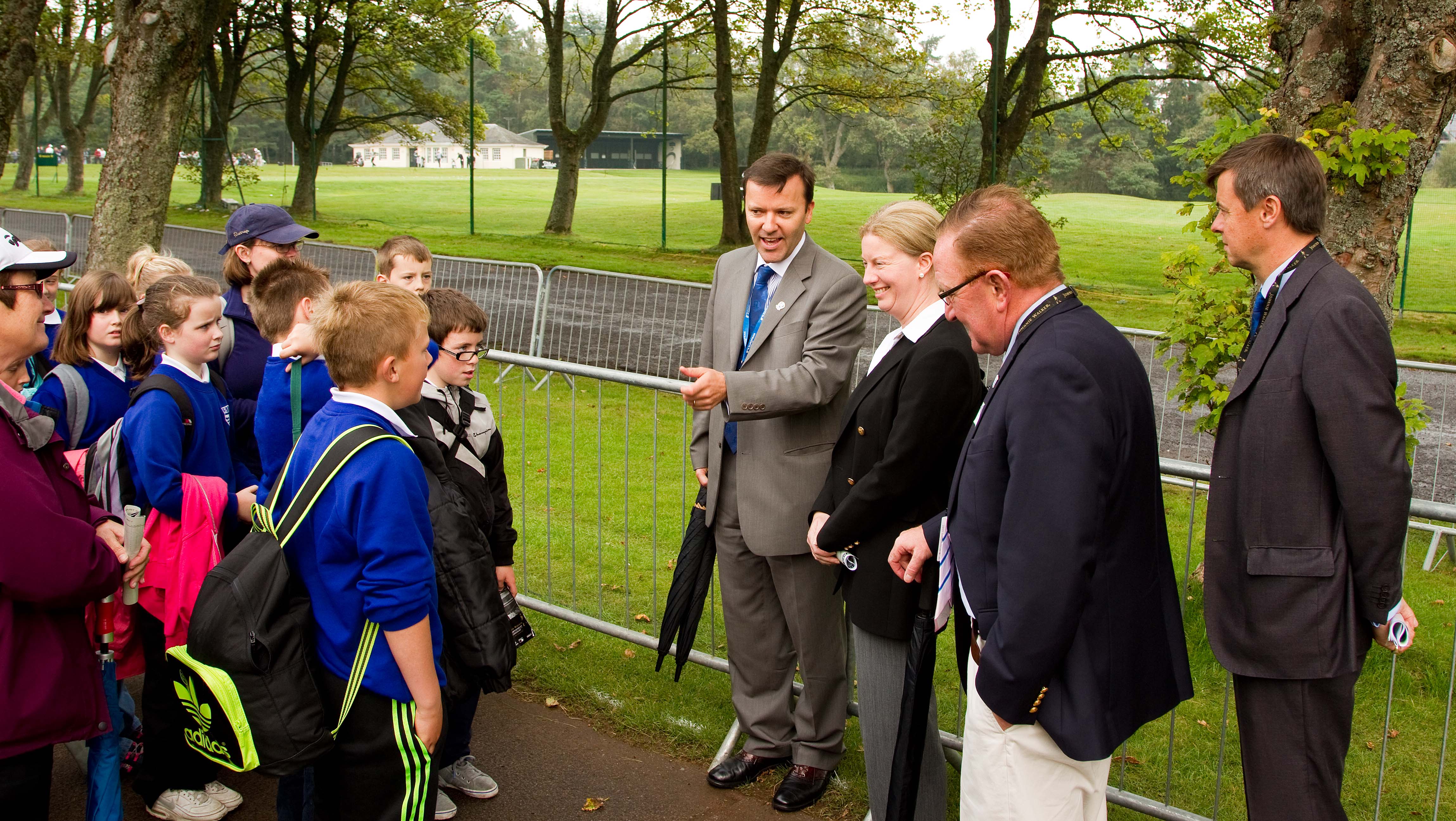 Shona Robison, Scotland's Minster for Commonwealth Games and Sport, along with Richard Hills, Ryder Cup Director and James Finnigan, European Tour, meet young children attending the Johnnie Walker Championship. (Photo - www.tourimages.com)