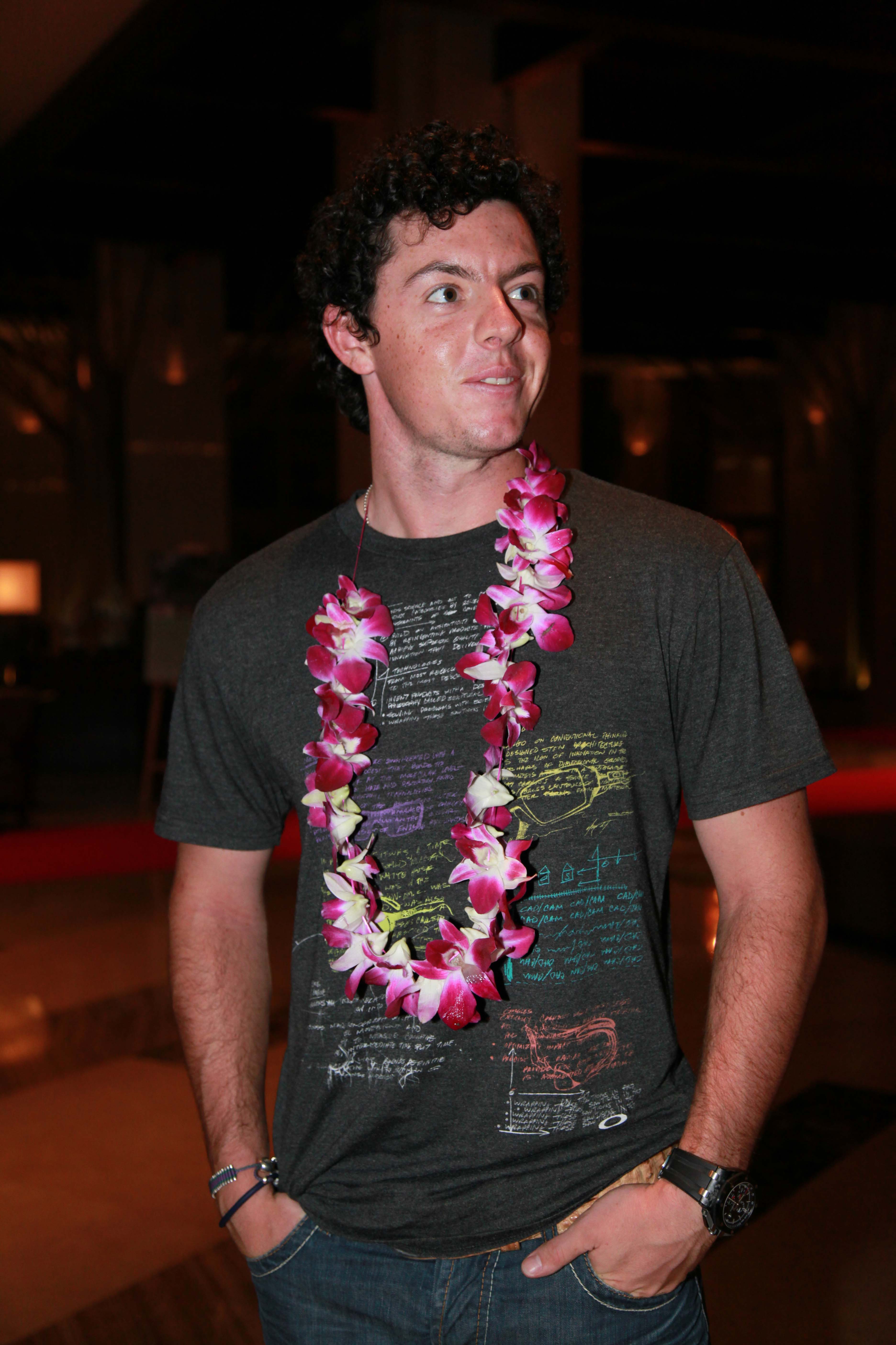 McIlroy, wearing t-shirt, jeans and track shoes, was welcomed by a line of young women holding Hawaiian-like leis.