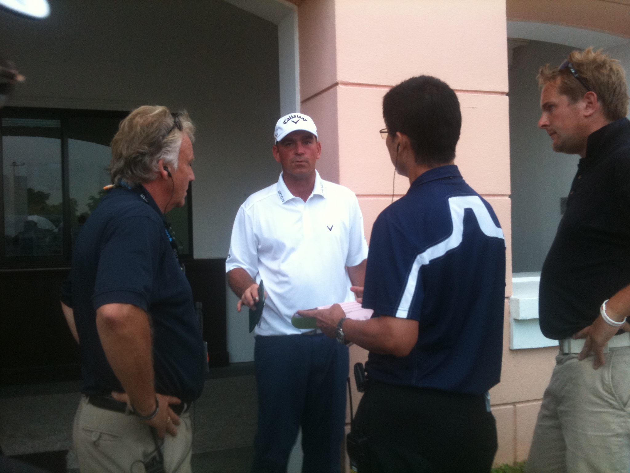 Thomas Bjorn in discussion with rules officials (Thomas Waldenstedt - left) after his second round in the Barclays Singapore Open. (Photo - www.golfbytourmiss.com)