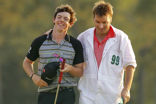 Rory McIlroy being comforted by his caddy J P Fitzgerald after ending 10 shots behind Charl Schwartzel.