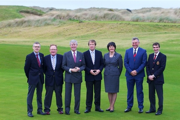 Conor Mallaghan (Carton House), Richard Hills (European Tour), Redmond O'Donoghue (Chairman, Failte Ireland), George O'Grady (European Tour), Arlene Foster, (Tourism Minister, Northern Ireland Executive) Darren Clarke and Philip Tweedie (Captain, Royal Portrush). Photo - Thanks to Getty Images/European Tour.