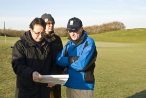 Pascal Grizot (holding documents) looking over plans for reworking the Le National course.