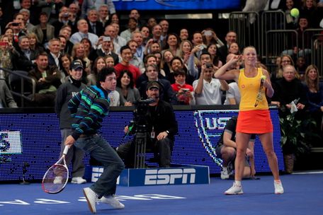 There was much fun between Sharapova and Wozinacki when Wozinacki, who was facing set and match point, asked the crowd if there were any men willing to step forward to face the Russian.