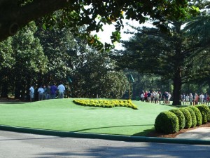 Augusta patrons line up to have their photo taken in front of the clubhouse
