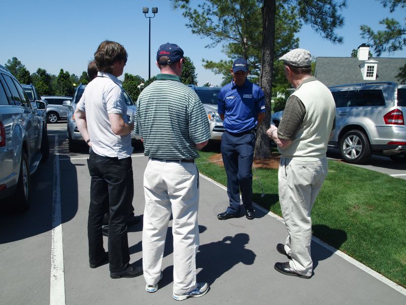 Padraig Harrington talks with the Irish press in the Augusta competitors car park