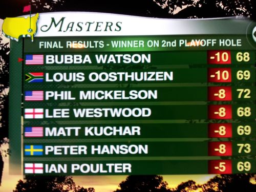 Final scoreboard - Bubba Watson wins the 2012 Masters.