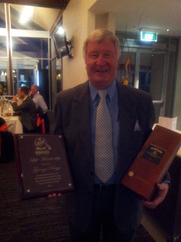 George Begg, The AGWA’s Newest Life Member With Plaque and Jamieson Whiskey