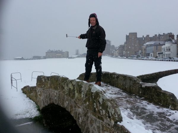 Bernie points to the R & A clubhouse with the Old Course blanketed in snow