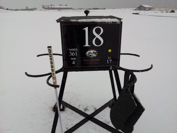 Old Course – 18th hole marker with New Course clubhouse in background