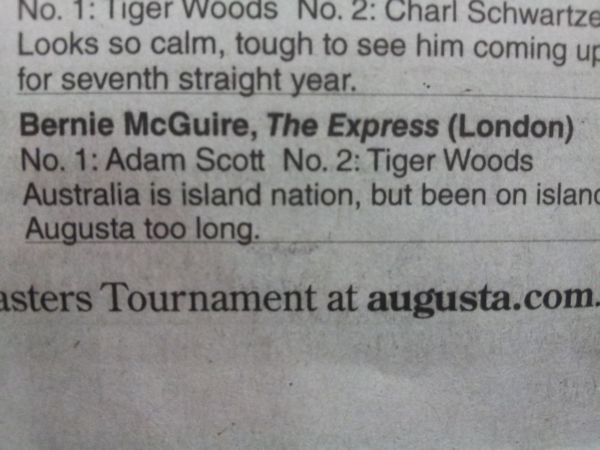 Bernie McGuire, and one half of www.golfbytourmiss.com has topped the Augusta National newspaper poll in picking new Masters champion, Adam Scott.
