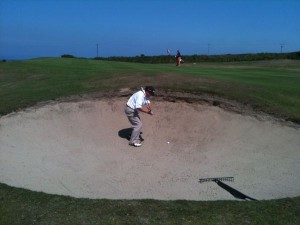 Michael Court playing out of a bunker – well trying to play from a bunker.