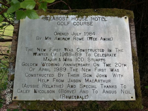The course itself was opened in July 1984 by Andrew Rome or wee Andie as the plaque says. However the first tee was reconstructed in the winter of 1988-89 to celebrate the 25th Golden Wedding Anniversary of Mr and Mrs I.C.D. Stuarts on 20th April, 1989.   It was also the Stuarts first son, John who assisted in the construction of the tee.