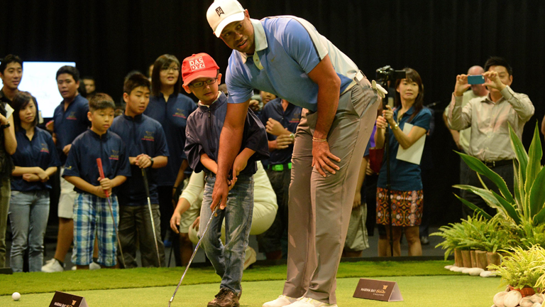 World number one golfer, Tiger Woods (R) helps a young boy to putt during a golf clinic session in Singapore on November 1, 2013. Tiger Woods has on previous visits participated in exclusive golf clinics with student athletes from the Singapore Sports School, Golf Academy, hosted by Marina Bay Sands. AFP PHOTO/ROSLAN RAHMAN