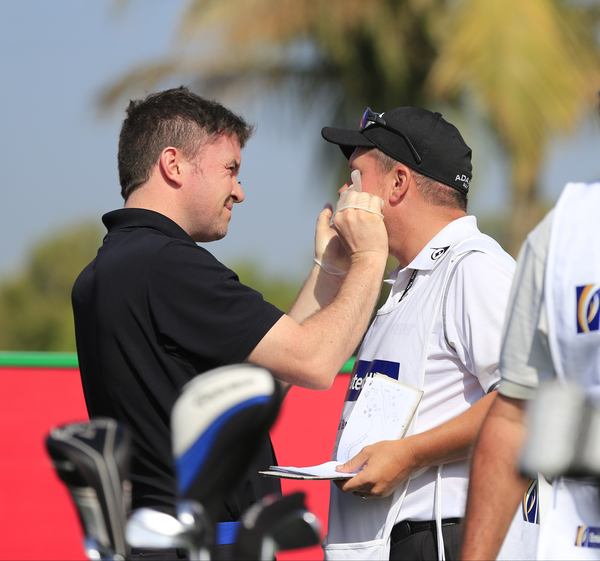 David Howell’s caddy lucky to escape after being accidentally struck during the 1st round in Dubai. (Photo – Eoin Clarke/www.golffile.ie)