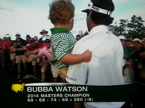 Watson walks with Caleb in his arms to the scorer's hut as a double Masters champion.