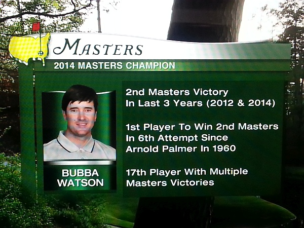 Watson ends a streak of four consecutive come-from-behind wins at the Masters. Last year, Adam Scott notched the fourth consecutive come-from-behind win at the Masters (Phil Mickelson/2010, Charl Schwartzel/2011 and Bubba Watson/2012). The last time there was four consecutive back-to-back come-from-behind wins at the Masters were by Ben Crenshaw/1984, Bernhard Langer/1985, Jack Nicklaus/1986 and Larry Mize/1987.