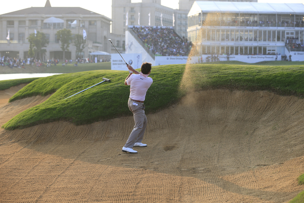 Spain’s Gonzalo Fernandez-Castano playing from a bunker down the last hole in last year’s BMW Masters final round. (Photo – Eoin Clarke/www.golffile.ie)