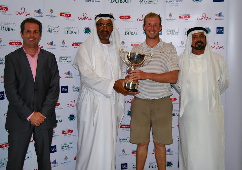 Luke Joy, the winner of the ASCORP GOLF CITIZEN Abu Dhabi Open, with Khalfan Al Kaabi, a Board member of the Emirates Golf Federation, Mohamed Juma Buamaim, chairman of the MENA Golf Tour, and