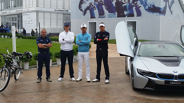 The script called for McGinley and Rose to jump aboard a two-seater state-of-the-art BMW pushbike and race Poulter and Wu who were seated in a futuristic BMW i8 sports sedan.