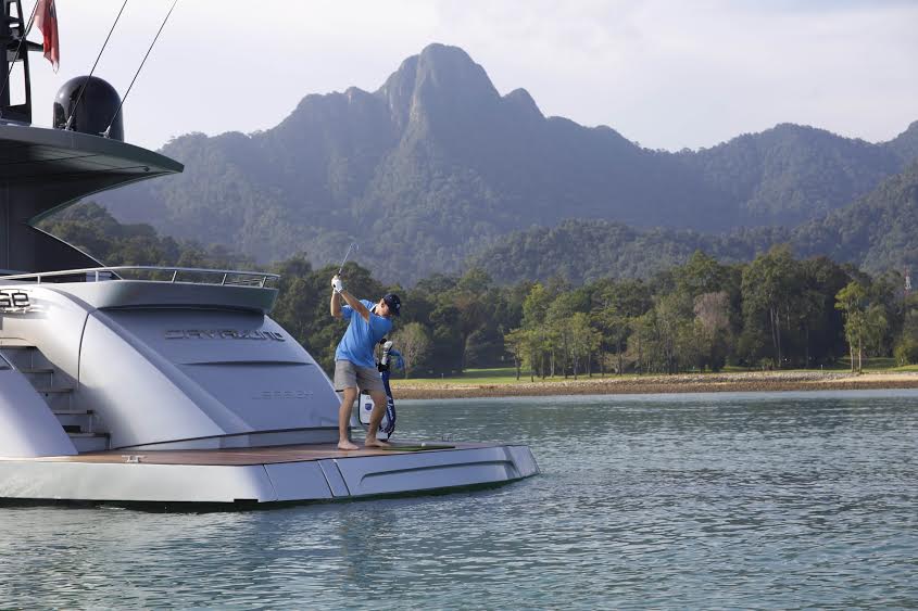 Ernie Els driving a ball off a boat to his new course opening in Malaysia.