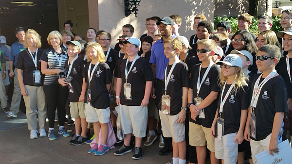 Despite seriously struggling with illness Tiger Woods delights a group of Tiger Woods Foundation members with a group photo after his round of 69. (Photo – www.golfbytourmiss.com)
