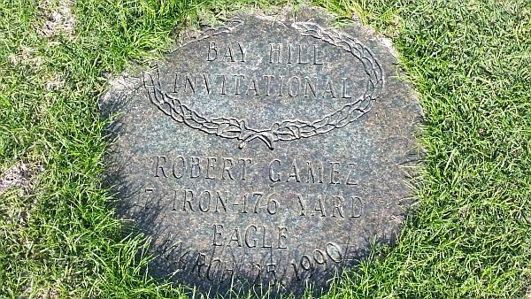 I walked with ‘Swamy’ to the spot where there is a plaque on the 18th to commemorate Robert Gamez holing his 176-yard, 7-iron shot for eagle to win the 1990 Nestle (And not Bay Hill) Invitational to deny Australia’s Greg Norman victory.