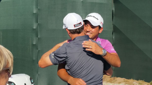 Jason Day being hugged by Open Champion Zach Johnson at the Plainfield CC and venue for this weeks Barclays Championship.