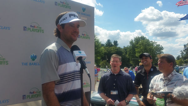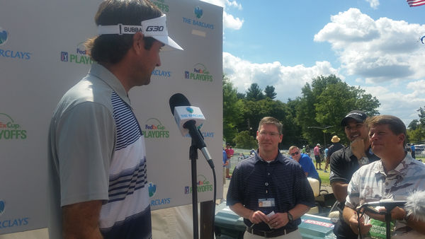 Jason Day , standing behind the PGA Tour’s John Bush (l) and AP’s renowned Doug Ferguson (r), turns jornalist asking Bubba Watson a question following today’s opening round of the Barclays Championship.