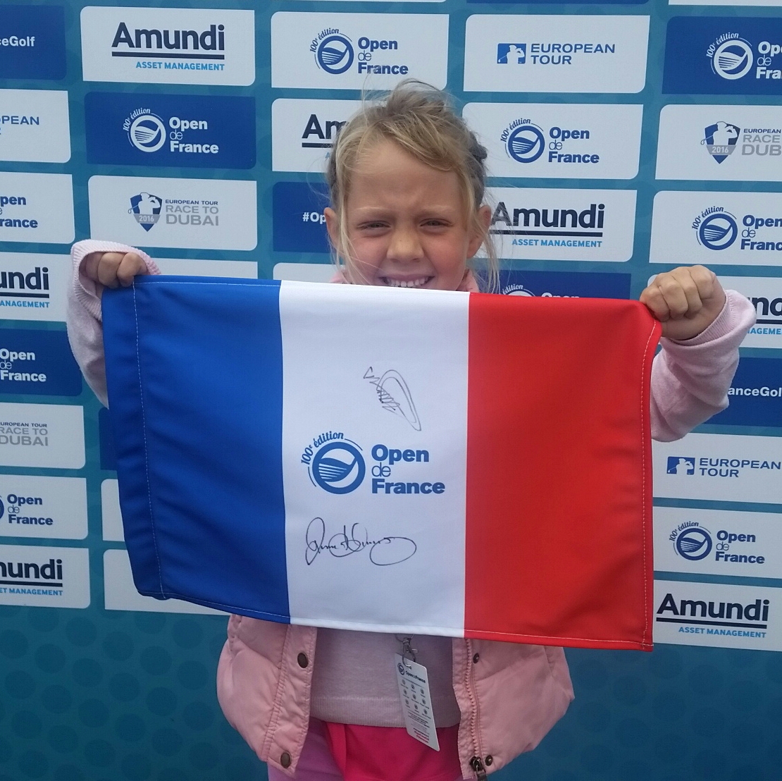 Young Mila proudly holds aloft her French flag signed by Victor Dubuisson and Rory McIlroy. (Photo – www.golfbytourmiss.com)