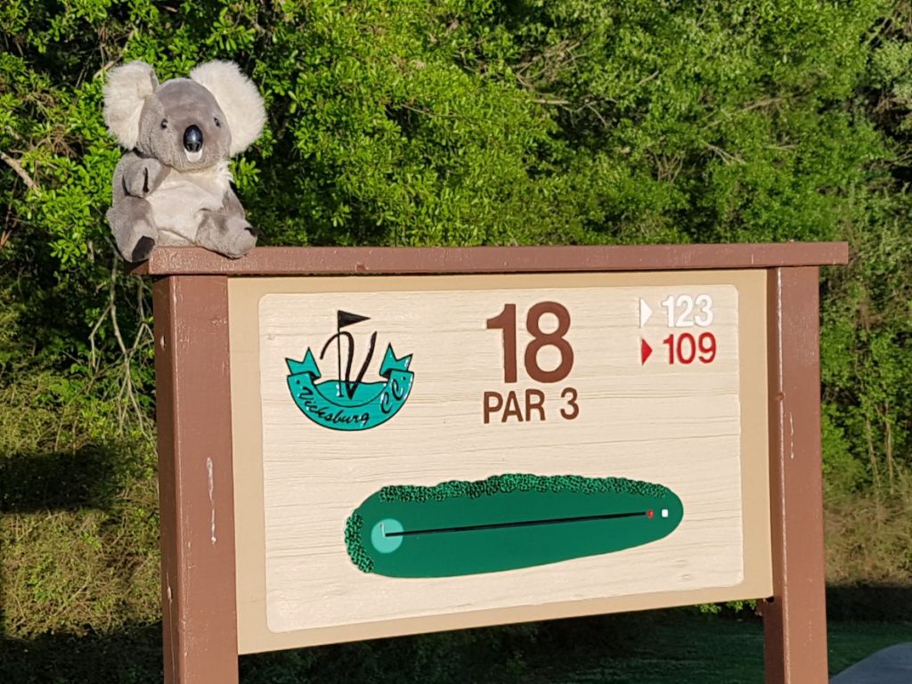Bernie’s Koala Bear much-travelled headcover somehow manages to find its way to yet another 18th hole tee marker.