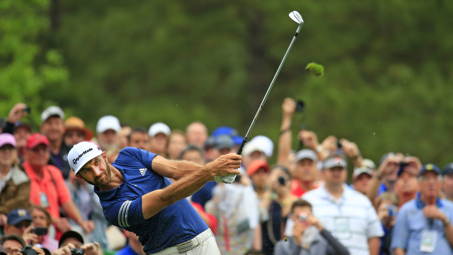 Dustin Johnson in practice on Monday but throws scare into his Masters chances after falling down a staircase on Wednesday.