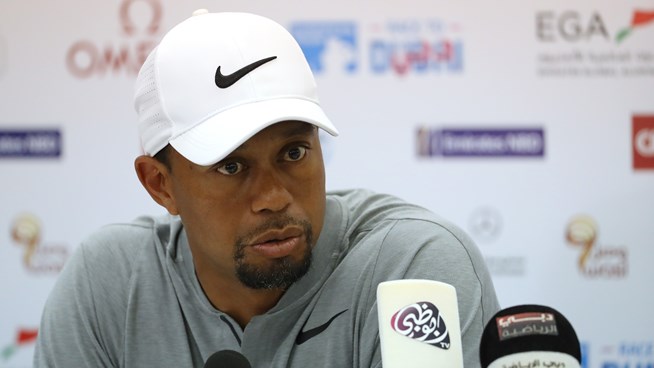 Tiger Woods speaking at a press conference ahead of the last time he was seen in competition and that being the Dubai Desert Classic earlier this year. (Photo – www.europeantour.com)