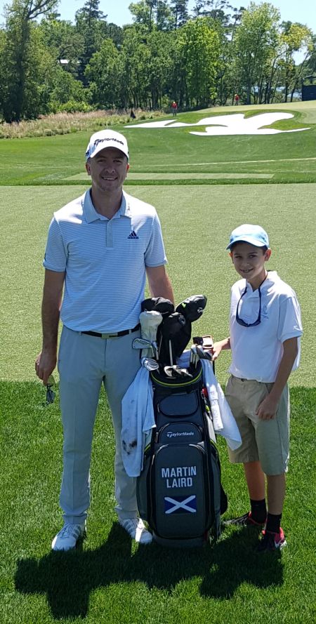 Martin Laird with young Christain who helPed in caddying at the first hole in the Wells Fargo Pro Am.