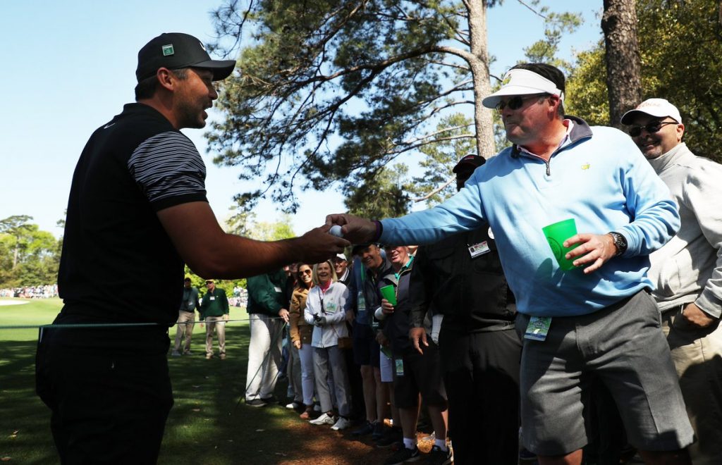 Aussie Jason Day is handed back his golf ball after it hit a tree and bounce of this patron’s shoulder and into his beer cup. (Photo – Gettys)