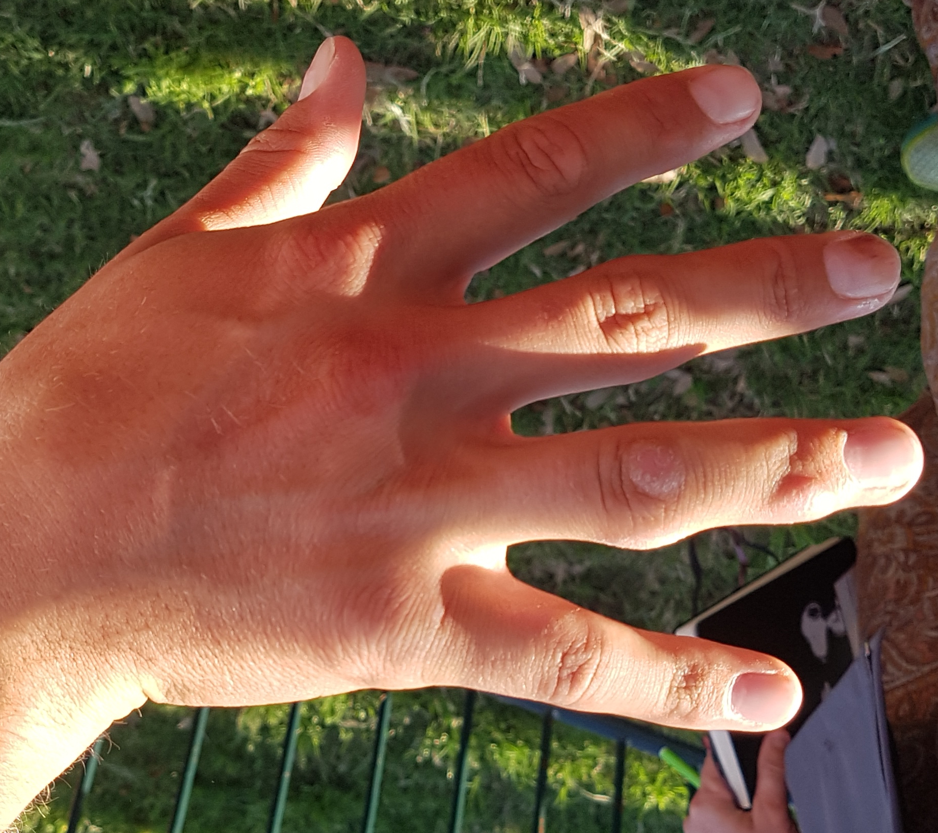 Calluses on the hands. It comes with the job of being a professional golfer.