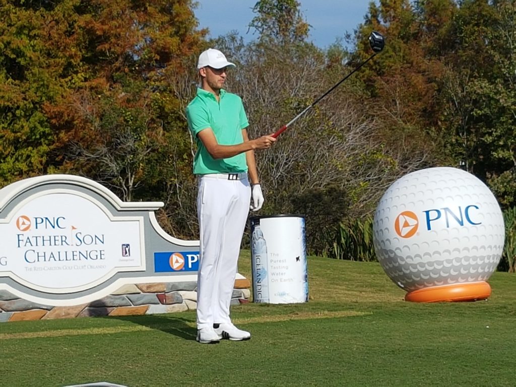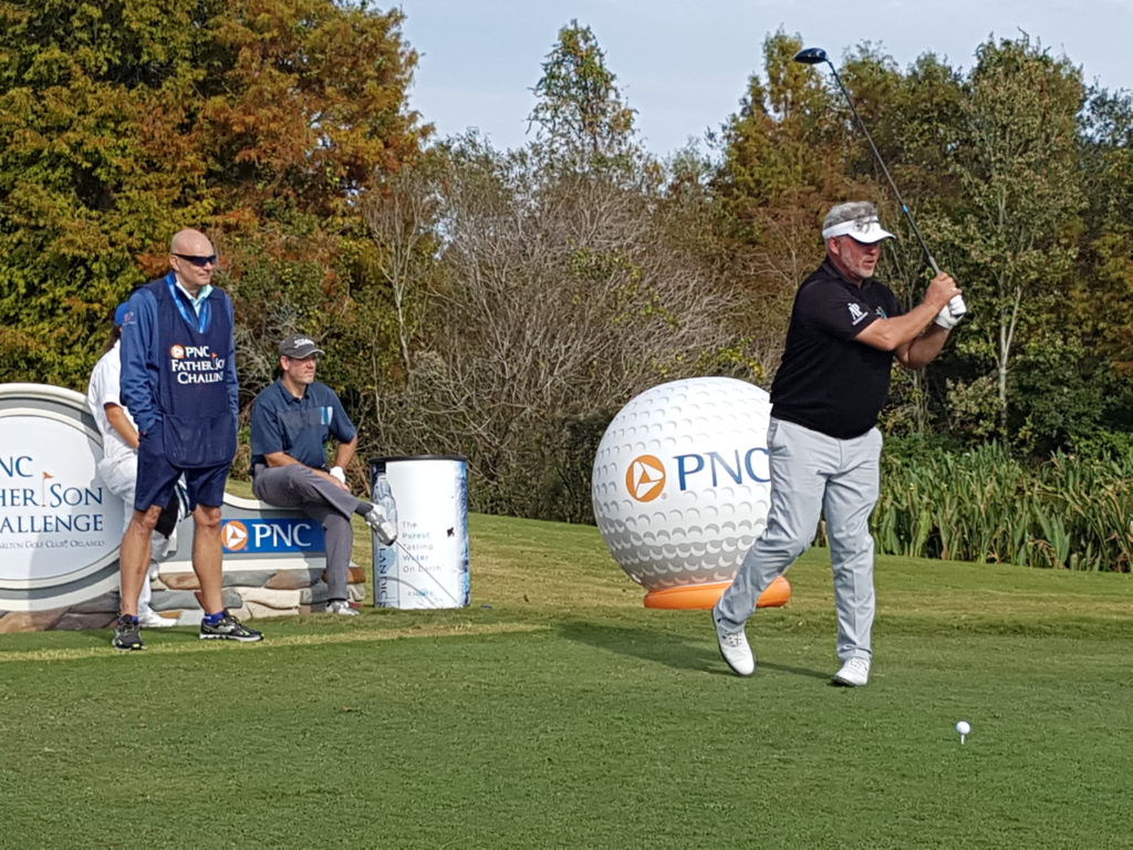 Darren Clarke teeing-off the 18th hole ahead of the PNC Father-and-Son Challenge. Clarke’s caddy Brad Whittle, who caddied for Scotland’s Russell Knox when he captured the WGC – HSBC Champions and Travelers Championship looks on. (Photo @tourmiss)
