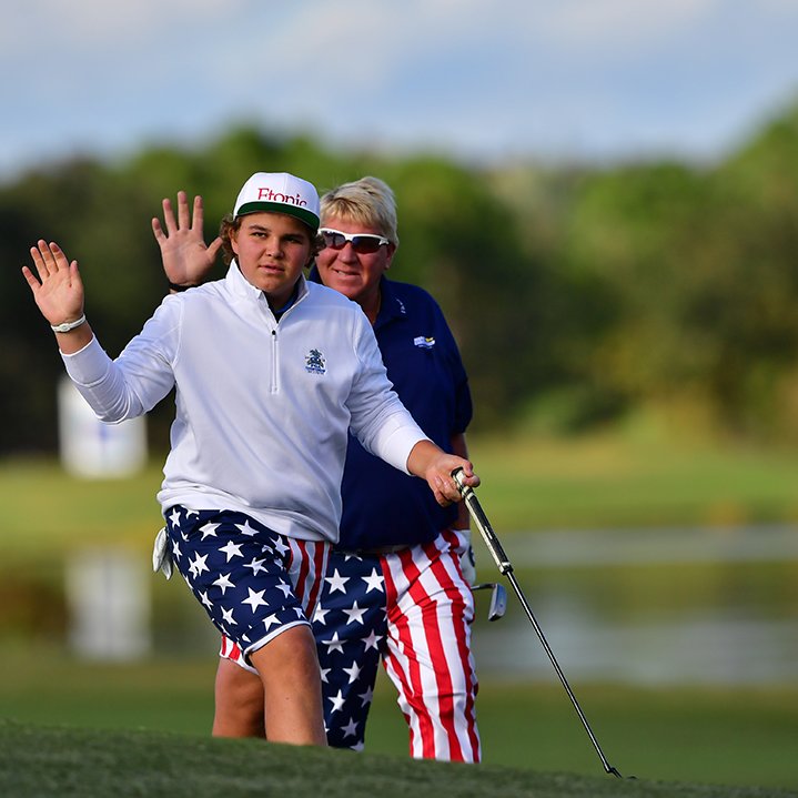 Tyrone Clarke, and the eldest son of Darren Clarke, celebrated birdiing the closing hole on the final day to be bogey-free on debut at the 2018 PNC Father-and-Son Challenge in Orlando.