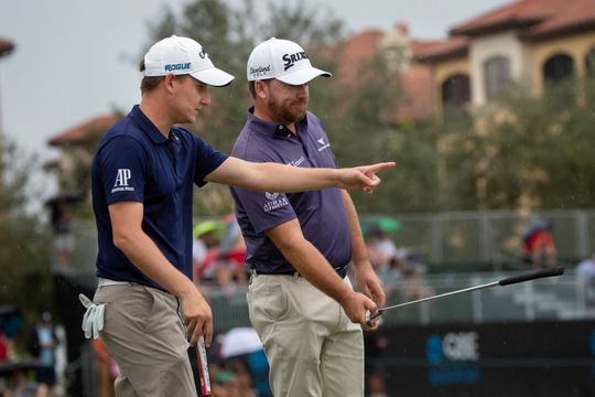 Emiliano Grillo helps Graeme McDowell in lining-up a putt on the final day of the 2018 QBE Shootout. (Photo – QBE Shootout)
