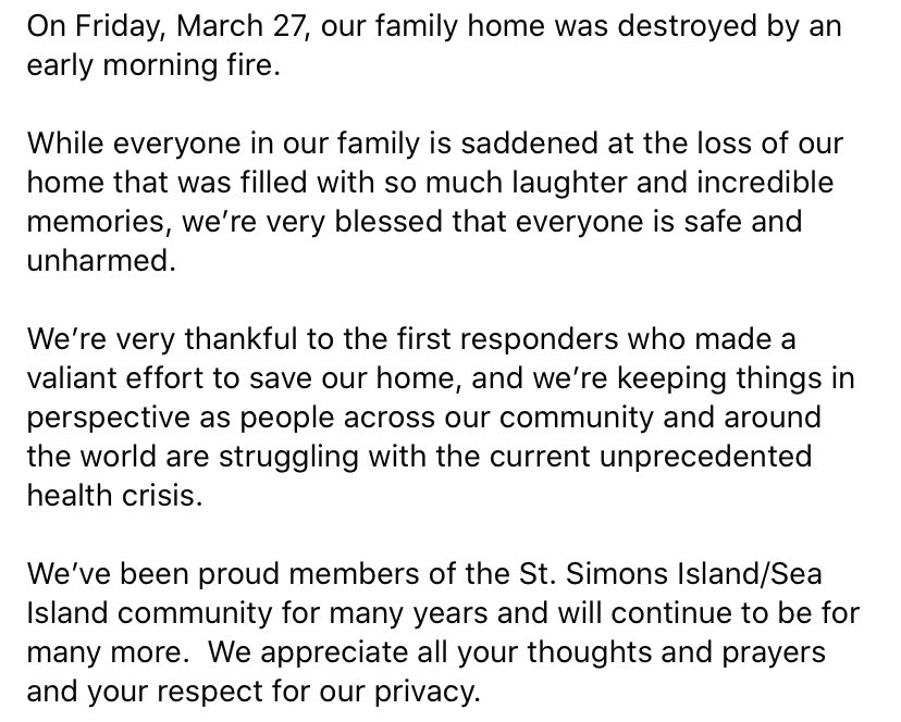 “We’ve been proud members of the St. Simons Island/Sea Island community for many years and will continue to be for many more,” he said. “We appreciate all your thoughts and prayers and your respect for our privacy.”