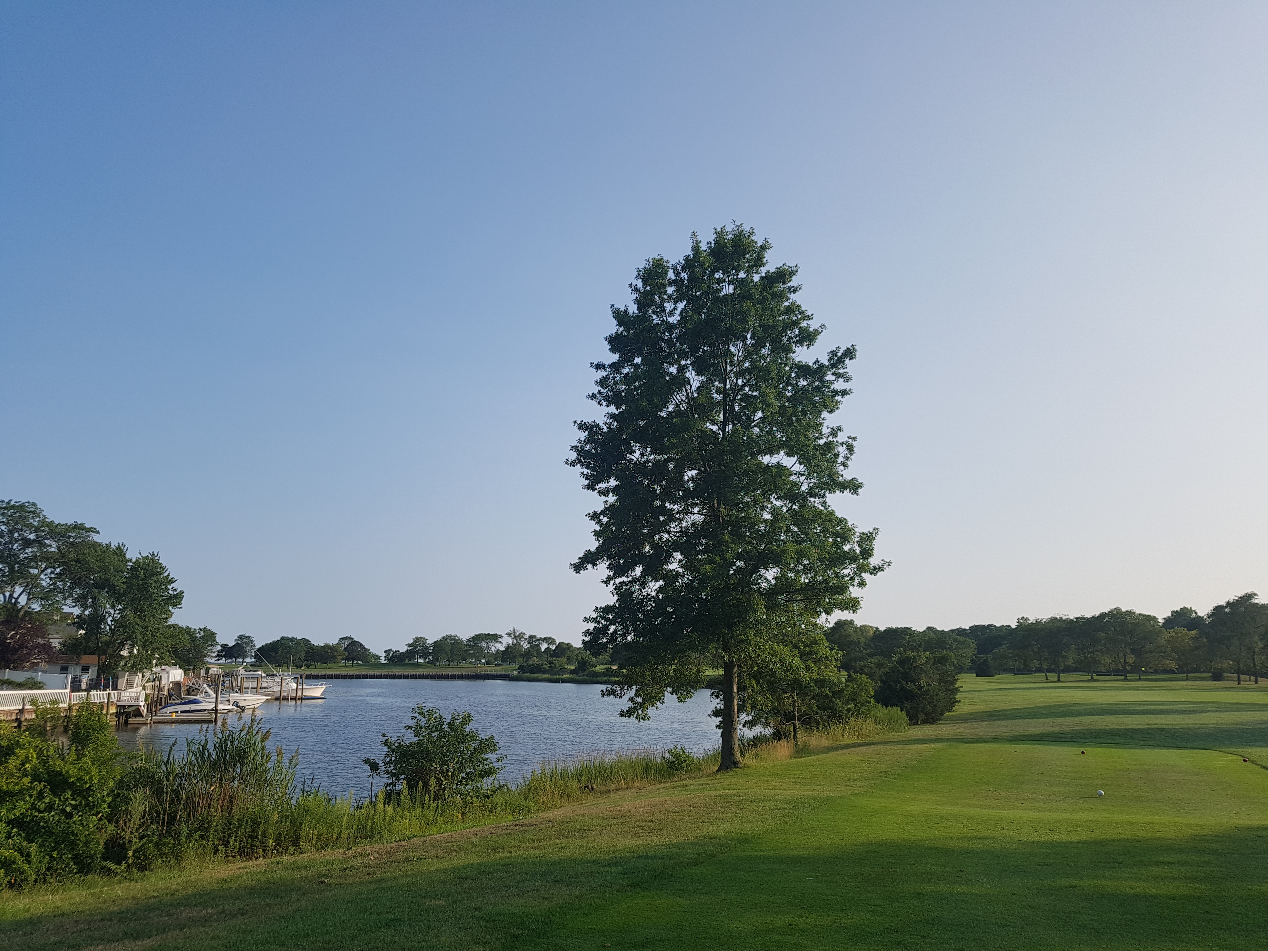 The view off the opening hole at Merrick Road Park GC – The par-5 first hole laid-out along Mud Creek. (Photo @tourmiss)