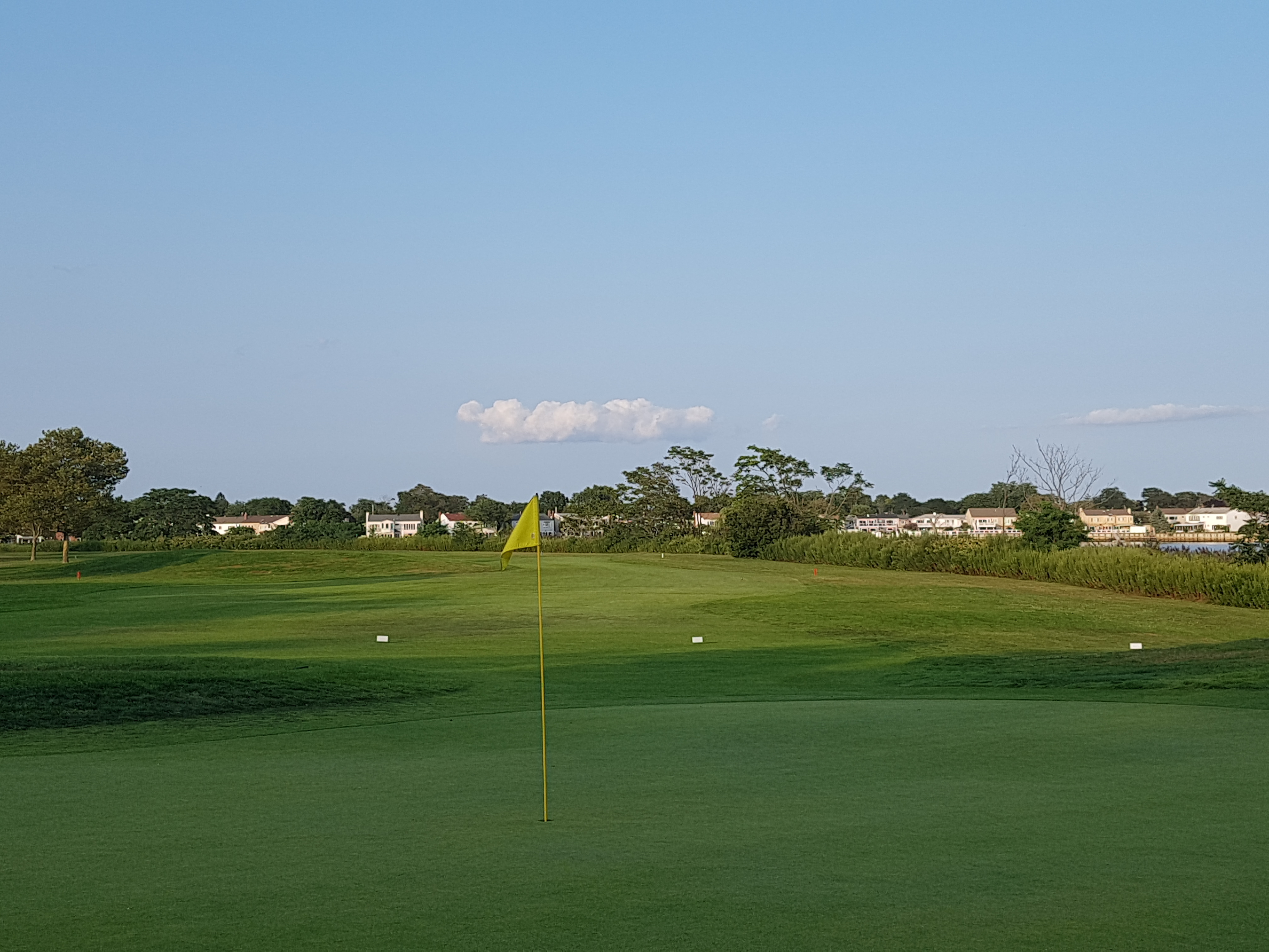 For a first-timer, the first hole can be distracting given the vista as you find your way around water’s edge to the putting surface.   There is this row of charming-looking houses laid out on the side away from the water along the aptly named ‘Clubhouse Road’ and at the back lined along the waterway and with the shoreline banked-up with wooden sleepers to protect from any erosion.  Every second house seemed to own a boat of sorts.