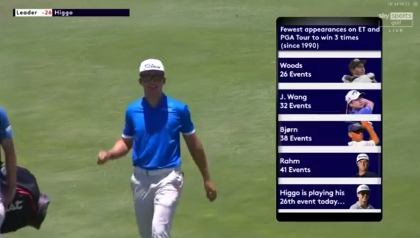 Now in a 26th Tour event, Higgo has joined Woods as the quickest player since 1990 on golf’s leading two Tour’s to win three events after Woods won his third of now 109 titles in early January 1997 and also in just 26 starts.