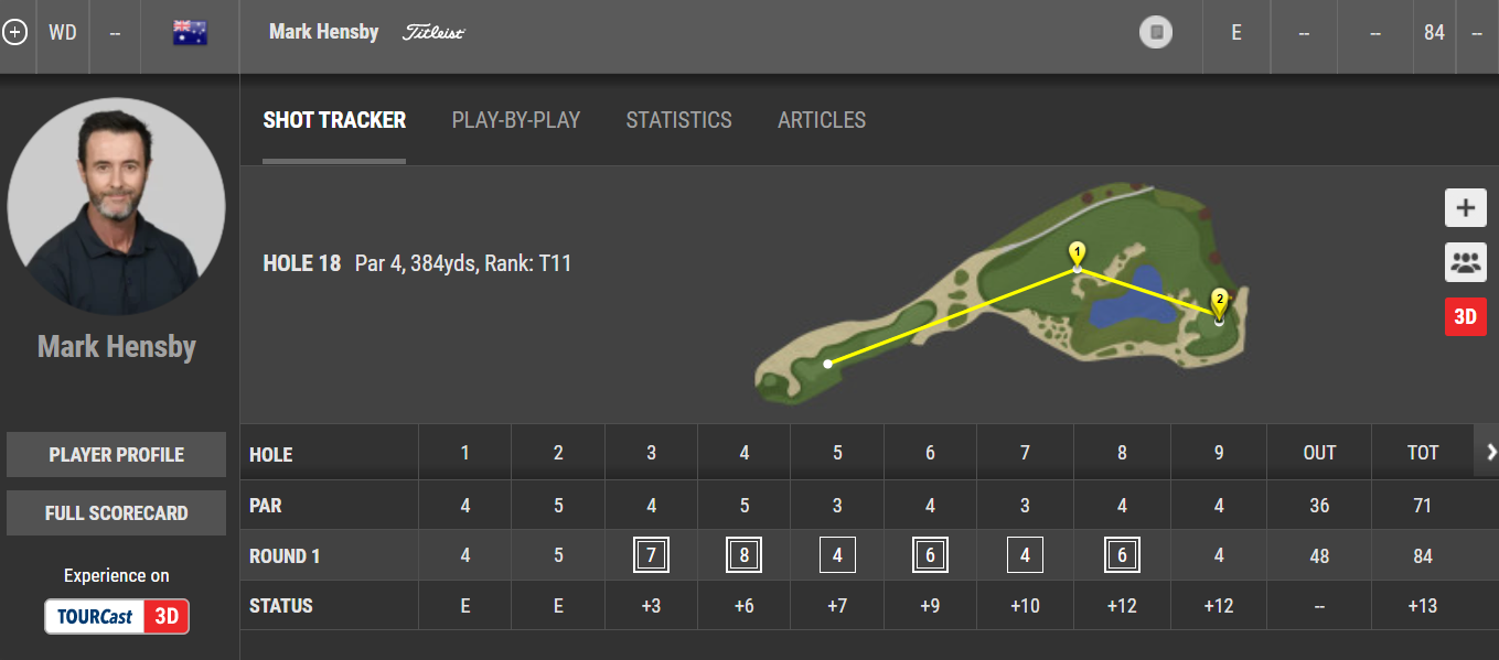 Hensby had unknowingly dropped the ball into play after hitting his third shot into the water at the fourth hole, meaning his bogey-birdie-par-birdie-par run became a triple bogey-bogey-double bogey-bogey-double bogey annihilation, pushing him to 12 over. Despite being rattled by the news, he shot a respectable 1-over 36 on the back, leaving him with a 13-over 84.