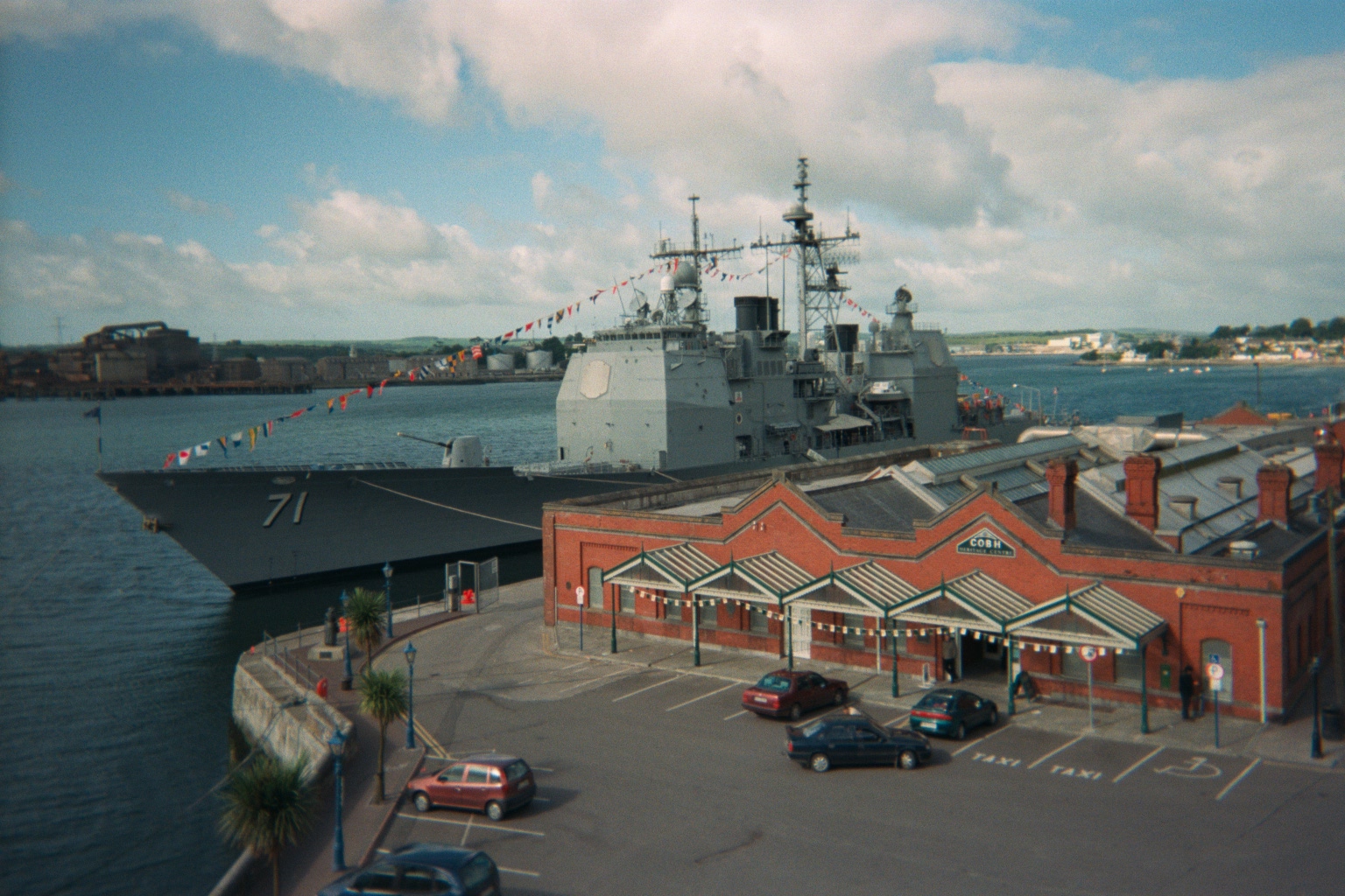 The guided missile USS Ross tied-up in 2001 at Cobh Harbour (Image – GolfByTourMiss)