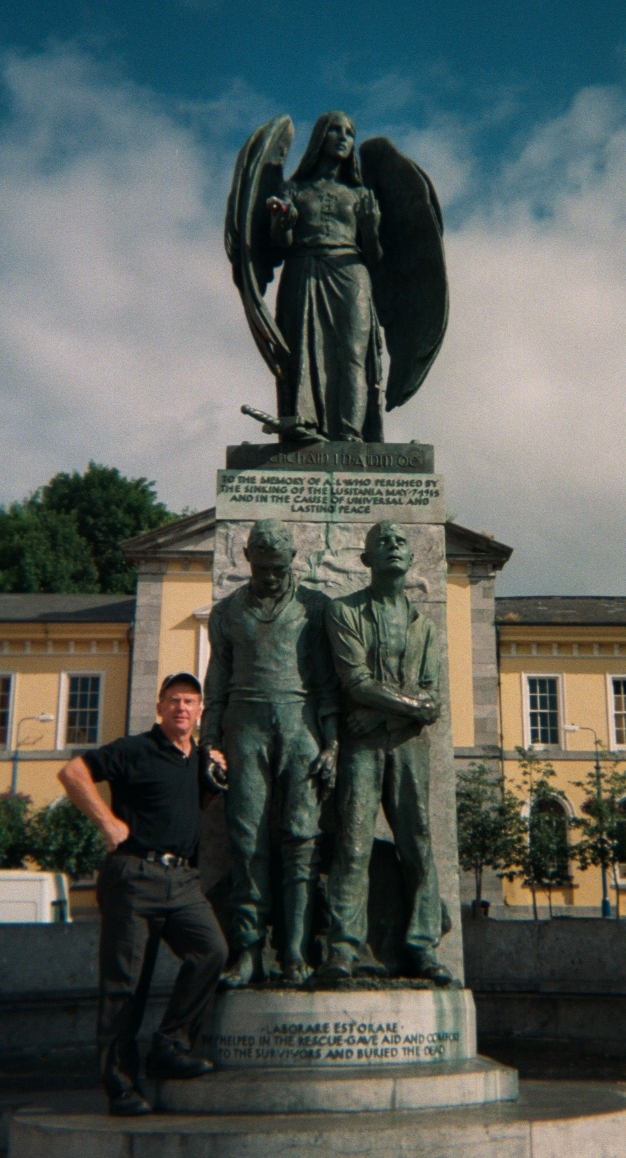 Bernie in 2001 in front of a Luisitania memorial in Cobh
