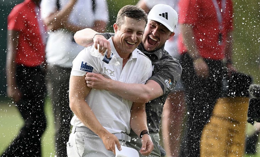 Brilliant …. Among the first to congratulate new Joburg Open champ Calum Hill was fellow Connor Syme, who finished in a share of ninth place. (Image – Sunshine Tour)