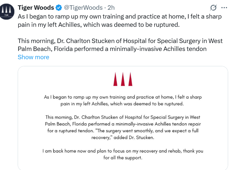 Disappointing news with Tiger Woods taking to ‘X’ to advise another physical setback ……