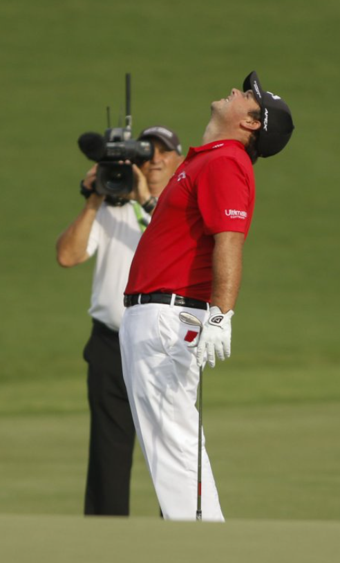 Patrick Reed agonises in missing a birdie on the 72nd green ar the 2017 PGA Championship at Quail Hollow. Image UPQ